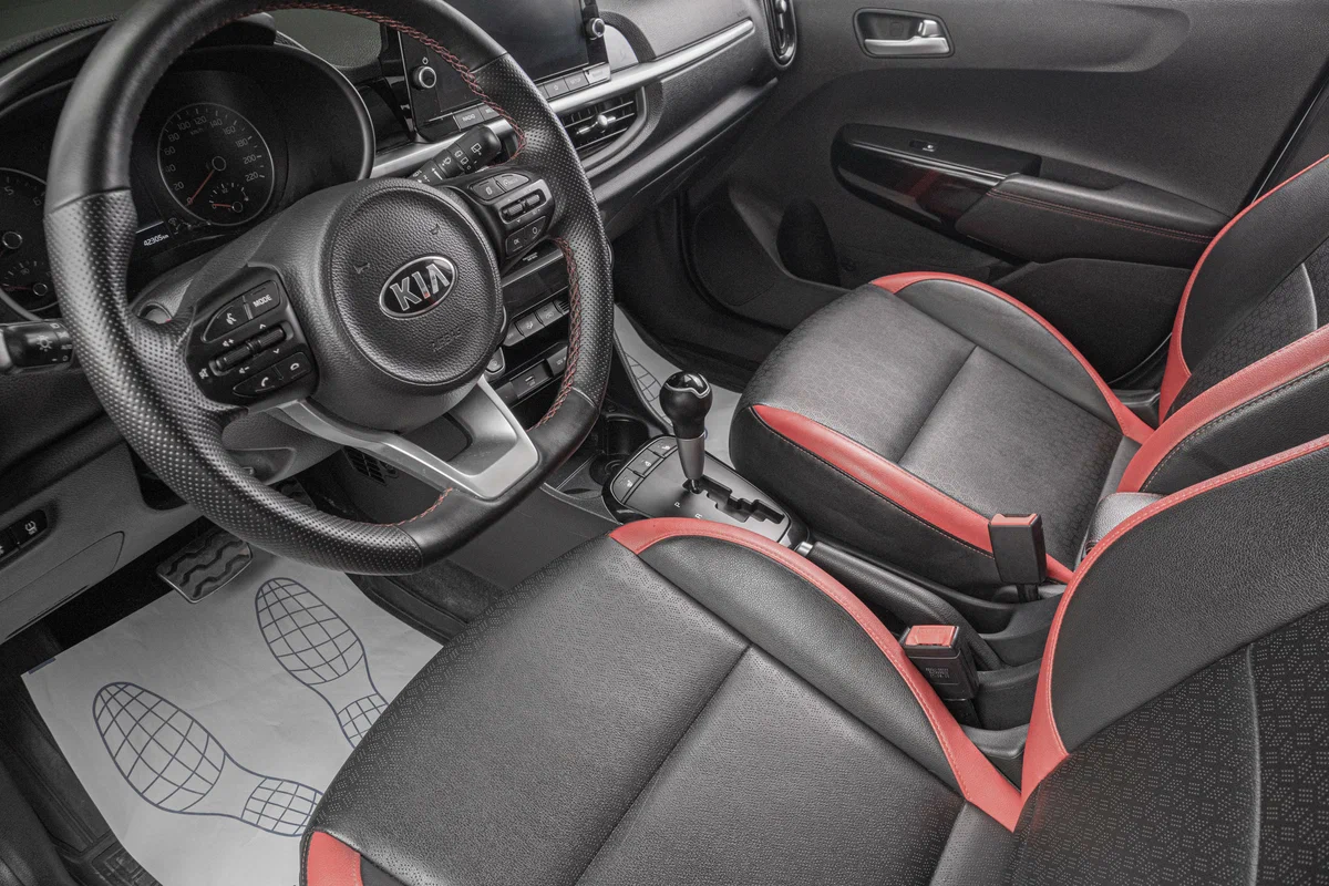 - Интерьер с отделкой искусственной кожей, с красными вставками